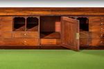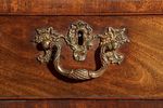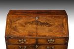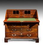 | A fine quality and indeed rather rare George III period mahogany bureau. The exceptional and beautifully striking feature is the choice of perfectly book-matched veneers that grace not only the drawers and cross-banded and cleated fall front, but unusually also the top. The fall front opens to a nicely fitted interior and the whole fitted with beautiful handles and escutcheons, in the Chippendale manner. | |